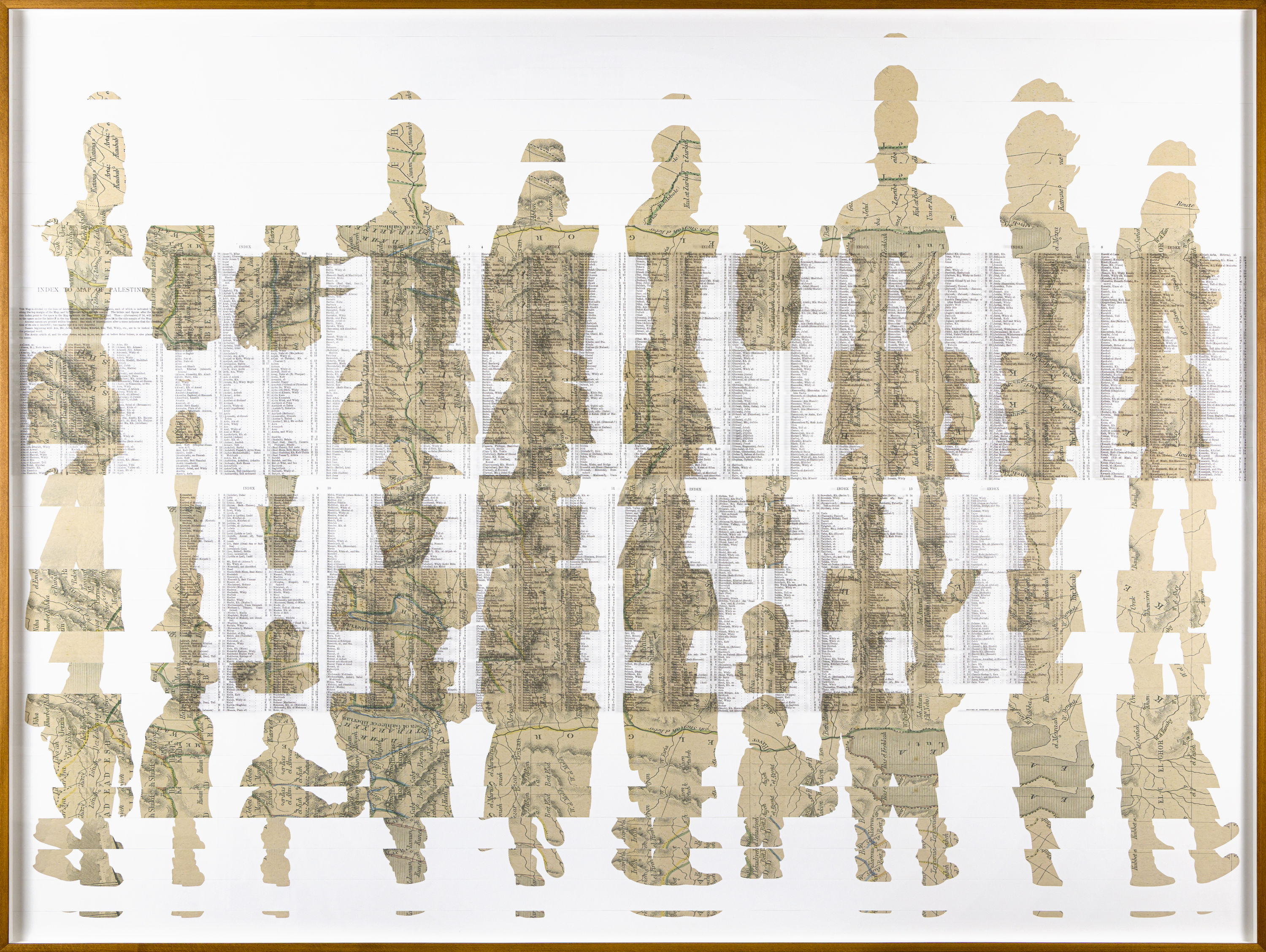 This concern with the politics of representation extends to the cartographic archive. In Victims of a Map (2025), Harb works with historical maps, reassembling them into abstract figural forms that evoke a human landscape fractured by occupation. The work addresses the disappearance of villages, towns, and neighbourhoods from official records, constructing a fictional geography that stands in for places rendered absent through processes of mapping and reclassification.